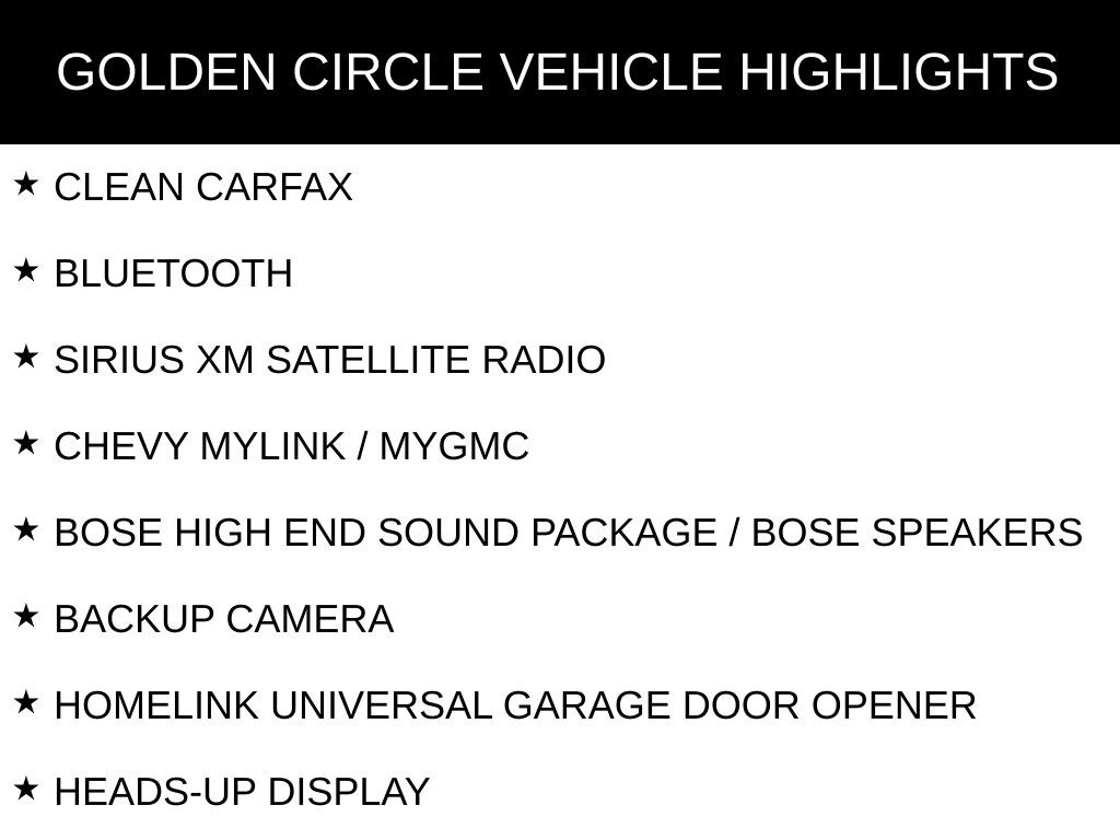 CLEAN CARFAX, BLUETOOTH, SIRIUS XM SATELLITE RADIO, CHEVY MYLINK / MYGMC, BOSE HIGH END SOUND PACKAGE / BOSE SPEAKERS, BACKUP CAMERA, HOMELINK UNIVERSAL GARAGE DOOR OPENER, HEADS-UP DISPLAY, KEYLESS PUSH BUTTON START, POWER DRIVER SEAT, POWER PASSENGER SEAT, HEATED FRONT LEATHER SEATS, MEMORY PACKAGE / MEMORY SEAT, POWER LIFTGATE, MEMORY PACKAGE, PERFORMANCE HANDLING PACKAGE, PREFERRED EQUIPMENT PACKAGE 3LT, 18" FRONT & 19" REAR PAINTED ALUMINUM WHEELS, 7 SPEAKERS, AIR CONDITIONING, AUTOMATIC TEMPERATURE CONTROL, CD PLAYER, COMPASS, CONVERTIBLE ROOF LINING, DRIVER & PASSENGER FRONTAL & SIDE IMPACT AIRBAGS, DRIVER VANITY MIRROR, DUAL FRONT IMPACT AIRBAGS, DUAL FRONT SIDE IMPACT AIRBAGS, ETR AM/FM STEREO W/CD/MP3/NAVIGATION, FRONT DUAL ZONE A/C, FRONT FOG LIGHTS, FULLY AUTOMATIC HEADLIGHTS, GLASS REAR WINDOW, HEATED DOOR MIRRORS, HIGH-INTENSITY DISCHARGE HEADLIGHTS, LOW TIRE PRESSURE WARNING, OCCUPANT SENSING AIRBAG, PANIC ALARM, PASSENGER VANITY MIRROR, POWER DOOR MIRRORS, POWER FOLDING CONVERTIBLE TOP, POWER STEERING, POWER STEERING COOLER, POWER WINDOWS, REAR WINDOW DEFROSTER, SPEED-SENSING STEERING, SPORT STEERING WHEEL, STIFFER SPRINGS, STIFFER STABILIZER BARS, TILT STEERING WHEEL, VARIABLY INTERMITTENT WIPERS.