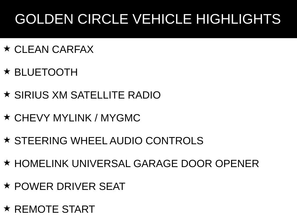 CLEAN CARFAX, BLUETOOTH, SIRIUS XM SATELLITE RADIO, CHEVY MYLINK / MYGMC, STEERING WHEEL AUDIO CONTROLS, HOMELINK UNIVERSAL GARAGE DOOR OPENER, POWER DRIVER SEAT, REMOTE START, SPRAY-IN BEDLINER, TOW PACKAGE / TRAILER PACKAGE, RUNNING BOARDS, ALL WEATHER FLOOR MATS, LT SERIES, CONVENIENCE PACKAGE, HEAVY-DUTY COOLING PACKAGE, HEAVY-DUTY HANDLING/TRAILERING SUSPENSION PACKAGE, HIGH PREFORMANCE SUSPENSION PACKAGE, LT1 EQUIPMENT PACKAGE, 20" CHROME-CLAD ALUMINUM WHEELS, 3.23 REAR AXLE RATIO, 6 SPEAKER AUDIO SYSTEM FEATURE, AIR CONDITIONING, COMPASS, DELAY-OFF HEADLIGHTS, DRIVER VANITY MIRROR, DUAL FRONT IMPACT AIRBAGS, DUAL FRONT SIDE IMPACT AIRBAGS, DUAL-ZONE AUTOMATIC CLIMATE CONTROL, ELECTRIC REAR-WINDOW DEFOGGER, EMERGENCY COMMUNICATION SYSTEM: ONSTAR DIRECTIONS & CONNECTIONS, EZ-LIFT TAILGATE, FRONT HALOGEN FOG LAMPS, FRONT LICENSE PLATE BRACKET, FULLY AUTOMATIC HEADLIGHTS, HEATED DOOR MIRRORS, LEATHER-WRAPPED STEERING WHEEL, LOCKING TAILGATE, LOW TIRE PRESSURE WARNING, OCCUPANT SENSING AIRBAG, OUTSIDE TEMPERATURE DISPLAY, OVERHEAD CONSOLE, PASSENGER VANITY MIRROR, POWER DOOR LOCKS W/REMOTE KEYLESS ENTRY, POWER DOOR MIRRORS, POWER WINDOWS, REAR STEP BUMPER, REMOTE KEYLESS ENTRY, REMOTE KEYLESS ENTRY W/2 TRANSMITTERS, SOLAR-RAY DEEP-TINTED GLASS, TILT STEERING WHEEL, ULTRASONIC REAR PARKING ASSIST W/AUDIBLE WARNING, VARIABLY INTERMITTENT WIPERS.