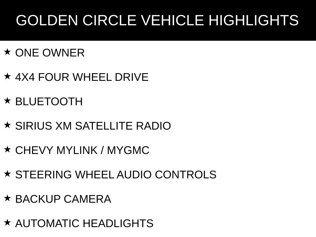 ONE OWNER, 4X4 FOUR WHEEL DRIVE, BLUETOOTH, SIRIUS XM SATELLITE RADIO, CHEVY MYLINK / MYGMC, STEERING WHEEL AUDIO CONTROLS, BACKUP CAMERA, AUTOMATIC HEADLIGHTS, DROP-IN BEDLINER, TOW PACKAGE / TRAILER PACKAGE, RUNNING BOARDS, ALL WEATHER FLOOR MATS, LT SERIES, PREFERRED EQUIPMENT PACKAGE 2LT, TRAILERING PACKAGE, 18" BRIGHT MACHINED ALUMINUM WHEELS, 3.42 REAR AXLE RATIO, 40/20/40 FRONT SPLIT BENCH SEAT, 6 SPEAKER AUDIO SYSTEM, AIR CONDITIONING, BODY COLOR BODYSIDE MOLDINGS, BODY COLOR REAR BUMPER W/CORNERSTEPS, BODY-COLOR DOOR HANDLES, BODY-COLOR GRILLE SURROUND, BRAKE ASSIST, COMPASS, DEEP-TINTED GLASS, DELAY-OFF HEADLIGHTS, DRIVER VANITY MIRROR, EMERGENCY COMMUNICATION SYSTEM: ONSTAR GUIDANCE, EZ LIFT & LOWER TAILGATE, FRONT BODY-COLOR BUMPER, FRONT CHROME BUMPER, HEATED DOOR MIRRORS, HIGH-INTENSITY DISCHARGE HEADLIGHTS, LOW TIRE PRESSURE WARNING, MANUAL TILT WHEEL STEERING COLUMN, OCCUPANT SENSING AIRBAG, OUTSIDE TEMPERATURE DISPLAY, OVERHEAD CONSOLE, PASSENGER VANITY MIRROR, POWER DOOR MIRRORS, POWER WINDOWS W/DRIVER EXPRESS UP, PREMIUM AUDIO SYSTEM: CHEVROLET MYLINK, REAR 60/40 FOLDING BENCH SEAT (FOLDS UP), REAR STEP BUMPER, REAR VISION CAMERA, REMOTE KEYLESS ENTRY, REMOTE LOCKING TAILGATE, SPEED CONTROL, SPEED-SENSING STEERING, TILT STEERING WHEEL, VARIABLY INTERMITTENT WIPERS.