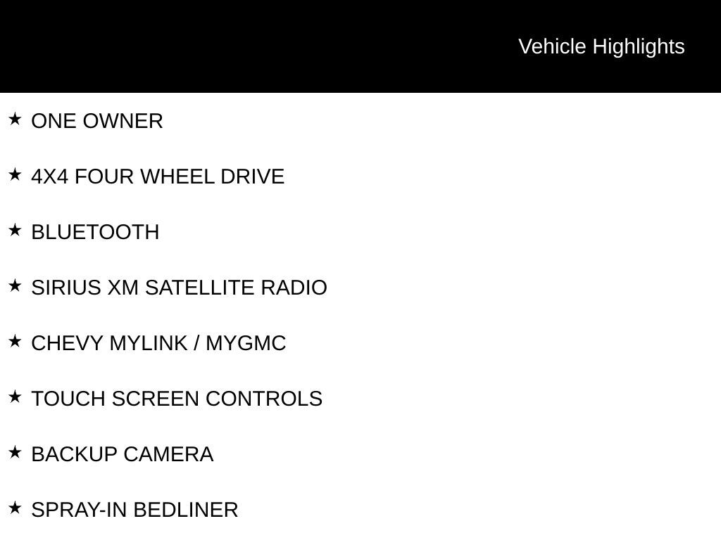 ONE OWNER, 4X4 FOUR WHEEL DRIVE, BLUETOOTH, SIRIUS XM SATELLITE RADIO, CHEVY MYLINK / MYGMC, TOUCH SCREEN CONTROLS, BACKUP CAMERA, SPRAY-IN BEDLINER, TOW PACKAGE / TRAILER PACKAGE, CUSTOM SERIES, CUSTOM CONVENIENCE PACKAGE, CUSTOM VALUE PACKAGE, PREFERRED EQUIPMENT PACKAGE 1CX, TRAILERING PACKAGE, 20" CHROME CLAD ALUMINUM WHEELS, 3.42 REAR AXLE RATIO, 6 SPEAKERS, AIR CONDITIONING, BODY COLOR REAR BUMPER W/CORNERSTEPS, BRAKE ASSIST, DEEP-TINTED GLASS, DELAY-OFF HEADLIGHTS, DUAL FRONT IMPACT AIRBAGS, DUAL FRONT SIDE IMPACT AIRBAGS, ELECTRIC REAR-WINDOW DEFOGGER, FRONT BODY-COLOR BUMPER, FRONT LICENSE PLATE KIT, HEATED DOOR MIRRORS, HEAVY-DUTY REAR LOCKING DIFFERENTIAL, LOW TIRE PRESSURE WARNING, MANUAL TILT WHEEL STEERING COLUMN, OCCUPANT SENSING AIRBAG, PASSENGER VANITY MIRROR, POWER DOOR MIRRORS, POWER WINDOWS W/DRIVER EXPRESS UP, PREMIUM AUDIO SYSTEM: CHEVROLET MYLINK, REAR STEP BUMPER, REMOTE KEYLESS ENTRY, REMOTE LOCKING TAILGATE, SPEED CONTROL, SPEED-SENSING STEERING, TILT STEERING WHEEL, VARIABLY INTERMITTENT WIPERS.