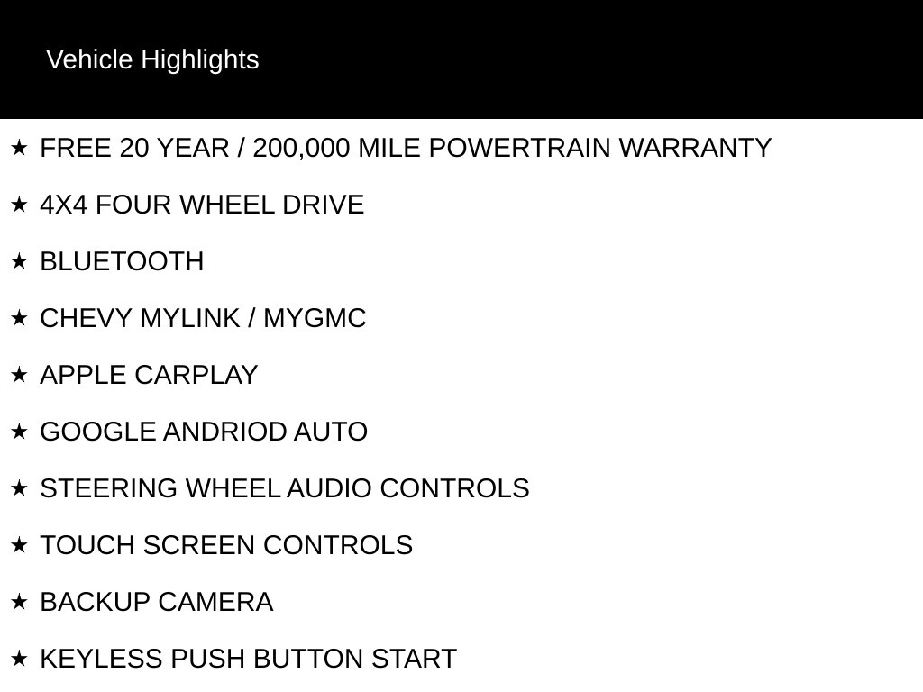 FREE 20 YEAR / 200,000 MILE POWERTRAIN WARRANTY, 4X4 FOUR WHEEL DRIVE, BLUETOOTH, CHEVY MYLINK / MYGMC, APPLE CARPLAY, GOOGLE ANDRIOD AUTO, STEERING WHEEL AUDIO CONTROLS, TOUCH SCREEN CONTROLS, BACKUP CAMERA, KEYLESS PUSH BUTTON START, REMOTE START, DROP-IN BEDLINER, TOW PACKAGE / TRAILER PACKAGE, INTEGRATED TRAILER BRAKE CONTROLLER, RST SERIES, PREFERRED EQUIPMENT PACKAGE 1SP, 18" X 8.5" BRIGHT SILVER PAINTED ALUMINUM WHEELS, 6-SPEAKER AUDIO SYSTEM, AIR CONDITIONING, BRAKE ASSIST, CHEVROLET CONNECTED ACCESS, CHEVROLET W/4G LTE, COMPASS, DEEP-TINTED GLASS, DELAY-OFF HEADLIGHTS, DRIVER VANITY MIRROR, ELECTRIC REAR-WINDOW DEFOGGER, ELECTRICAL LOCK CONTROL STEERING COLUMN, ELECTRONIC CRUISE CONTROL, FRONT CENTER ARMREST W/STORAGE, FRONT FOG LIGHTS, FRONT FRAME-MOUNTED BLACK RECOVERY HOOKS, FULLY AUTOMATIC HEADLIGHTS, HEATED DOOR MIRRORS, LOW TIRE PRESSURE WARNING, OCCUPANT SENSING AIRBAG, OUTSIDE TEMPERATURE DISPLAY, OVERHEAD CONSOLE, PANIC ALARM, PASSENGER VANITY MIRROR, POWER DOOR LOCKS, POWER DOOR MIRRORS, POWER WINDOWS, REAR STEP BUMPER, REAR VISION CAMERA, REAR WINDOW DEFROSTER, REMOTE KEYLESS ENTRY, SINGLE-ZONE MANUAL/SEMI-AUTOMATIC AIR CONDITIONING, SPEED CONTROL, SPEED-SENSING STEERING, TILT STEERING WHEEL, URETHANE STEERING WHEEL, VARIABLY INTERMITTENT WIPERS.