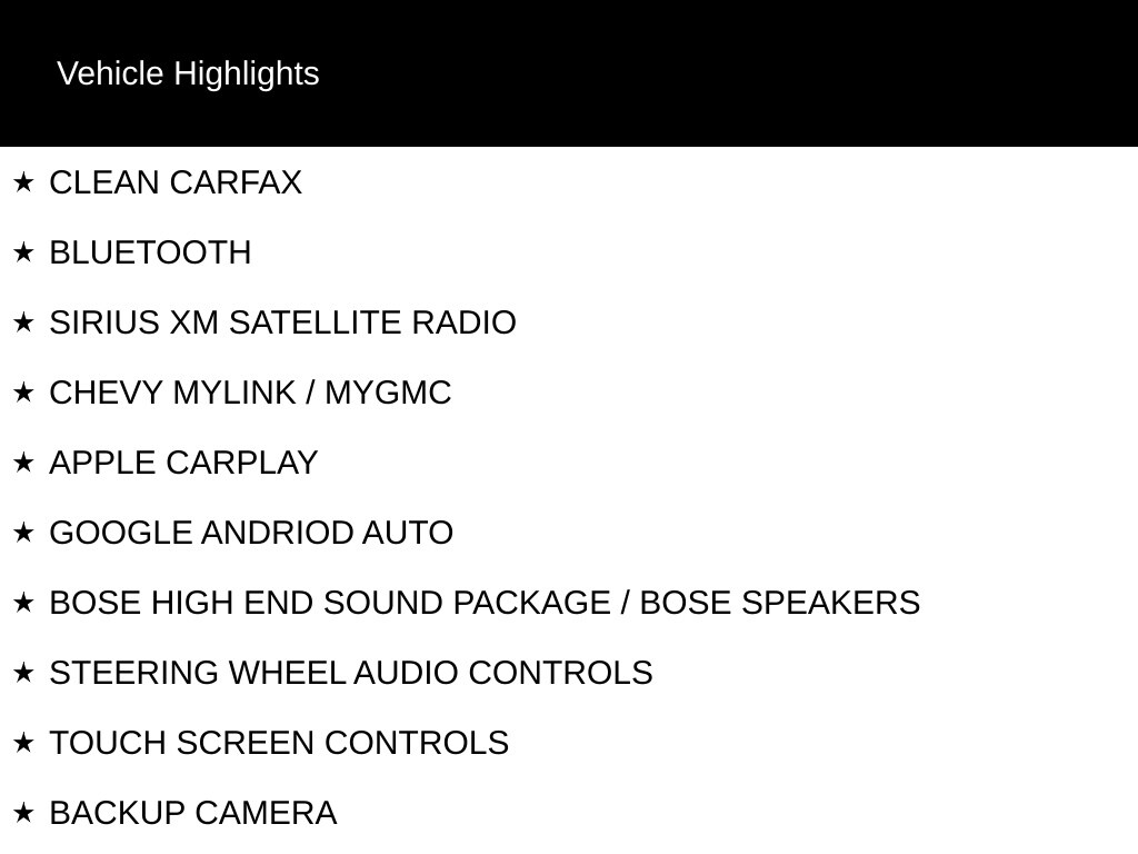 CLEAN CARFAX, BLUETOOTH, SIRIUS XM SATELLITE RADIO, CHEVY MYLINK / MYGMC, APPLE CARPLAY, GOOGLE ANDRIOD AUTO, BOSE HIGH END SOUND PACKAGE / BOSE SPEAKERS, STEERING WHEEL AUDIO CONTROLS, TOUCH SCREEN CONTROLS, BACKUP CAMERA, HOMELINK UNIVERSAL GARAGE DOOR OPENER, WI-FI HOTSPOT, KEYLESS PUSH BUTTON START, AUTOMATIC HEADLIGHTS, POWER DRIVER SEAT, POWER PASSENGER SEAT, HEATED FRONT LEATHER SEATS, 3RD ROW SEAT, MEMORY PACKAGE / MEMORY SEAT, REMOTE START, POWER LIFTGATE, TOW PACKAGE / TRAILER PACKAGE, RUNNING BOARDS, LT SERIES, PREFERRED EQUIPMENT PACKAGE 1LT, 18" BRIGHT SILVER PAINTED ALUMINUM WHEELS, AIR CONDITIONING, AUTO-DIMMING REAR-VIEW MIRROR, AUTOMATIC TEMPERATURE CONTROL, BOSE 9-SPEAKER STEREO AUDIO SYSTEM FEATURE, COMPASS, DELAY-OFF HEADLIGHTS, DRIVER VANITY MIRROR, EMERGENCY COMMUNICATION SYSTEM: ONSTAR AND CHEVROLET CONNECTED SERVICES CAPABLE, FRONT DUAL ZONE A/C, HEATED DOOR MIRRORS, LEATHER-WRAPPED STEERING WHEEL, LED DAYTIME RUNNING LAMPS, LOW TIRE PRESSURE WARNING, OCCUPANT SENSING AIRBAG, OUTSIDE TEMPERATURE DISPLAY, OVERHEAD CONSOLE, PANIC ALARM, PASSENGER VANITY MIRROR, POWER DOOR MIRRORS, POWER WINDOWS, PREMIUM SMOOTH RIDE SUSPENSION, RAIN SENSING WIPERS, REAR AIR CONDITIONING, REAR WINDOW DEFROSTER, REAR WINDOW WIPER, REMOTE KEYLESS ENTRY, SPEED-SENSING STEERING, TELESCOPING STEERING WHEEL, TILT STEERING WHEEL, VARIABLY INTERMITTENT WIPERS.