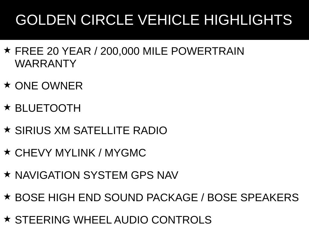FREE 20 YEAR / 200,000 MILE POWERTRAIN WARRANTY, ONE OWNER, BLUETOOTH, SIRIUS XM SATELLITE RADIO, CHEVY MYLINK / MYGMC, NAVIGATION SYSTEM GPS NAV, BOSE HIGH END SOUND PACKAGE / BOSE SPEAKERS, STEERING WHEEL AUDIO CONTROLS, BACKUP CAMERA, KEYLESS PUSH BUTTON START, AUTOMATIC HEADLIGHTS, ADAPTIVE CRUISE CONTROL, POWER DRIVER SEAT, HEATED FRONT LEATHER SEATS, PANORAMIC SUNROOF/MOONROOF, MEMORY PACKAGE / MEMORY SEAT, REMOTE START, POWER LIFTGATE, HEATED STEERING WHEEL, ALL WEATHER FLOOR MATS, RS SERIES, ADVANCED SAFETY PACKAGE, FLOOR LINER PACKAGE, INFOTAINMENT PACKAGE, PREFERRED EQUIPMENT PACKAGE 1RS, RS LEATHER PACKAGE, SAFETY & INFORAINMENT PACKAGE, 19" ALUMINUM WHEELS, AIR CONDITIONING, AUTOMATIC TEMPERATURE CONTROL, BOSE PREMIUM 7-SPEAKER AUDIO SYSTEM FEATURE, BRAKE ASSIST, COMPASS, DELAY-OFF HEADLIGHTS, DRIVER VANITY MIRROR, EMERGENCY COMMUNICATION SYSTEM: ONSTAR AND CHEVROLET CONNECTED SERVICES CAPABLE, FRONT DUAL ZONE A/C, LOW TIRE PRESSURE WARNING, OCCUPANT SENSING AIRBAG, OUTSIDE HEATED POWER-ADJUSTABLE MIRRORS, OUTSIDE TEMPERATURE DISPLAY, OVERHEAD CONSOLE, PANIC ALARM, PASSENGER VANITY MIRROR, POWER SUNROOF, POWER WINDOWS, REAR WINDOW DEFROSTER, REAR WINDOW WIPER, REMOTE KEYLESS ENTRY, SPEED-SENSING STEERING, TELESCOPING STEERING WHEEL, TILT STEERING WHEEL, VARIABLY INTERMITTENT WIPERS.