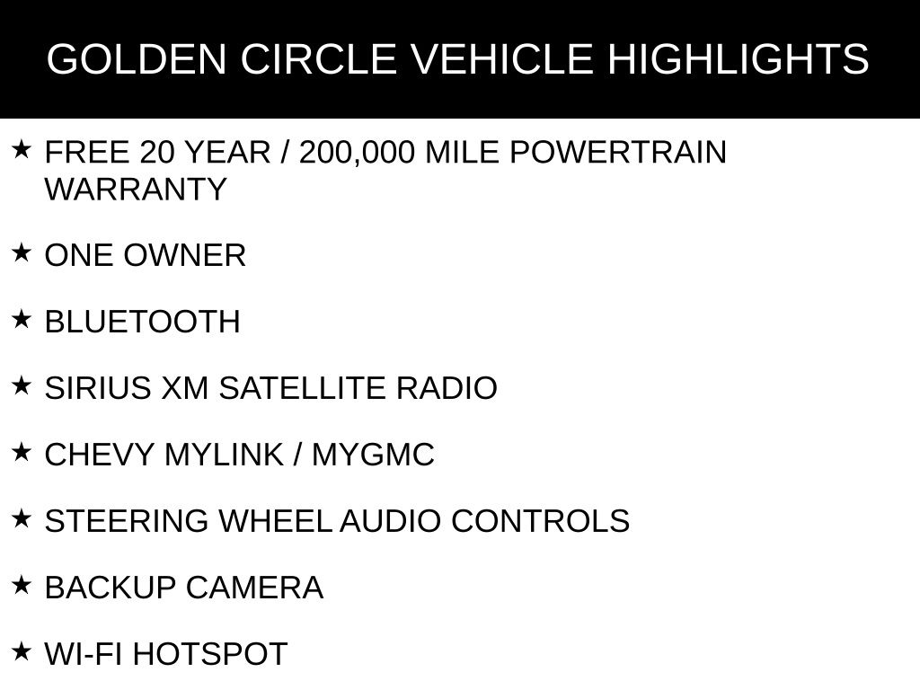 FORD BLUE ADVANTAGE CERTIFIED, FREE 20 YEAR / 200,000 MILE POWERTRAIN WARRANTY, ONE OWNER, BLUETOOTH, SIRIUS XM SATELLITE RADIO, CHEVY MYLINK / MYGMC, STEERING WHEEL AUDIO CONTROLS, BACKUP CAMERA, WI-FI HOTSPOT, HEATED FRONT CLOTH SEATS, HEATED STEERING WHEEL, 1RS SERIES, DRIVER CONFIDENCE PACKAGE, PREFERRED EQUIPMENT PACKAGE 1RS, 18" BLACK-PAINTED MACHINED ALUMINUM WHEELS, 4-SPEAKER AUDIO SYSTEM FEATURE, AIR CONDITIONING, COMPASS, DELAY-OFF HEADLIGHTS, DRIVER VANITY MIRROR, DUAL FRONT IMPACT AIRBAGS, DUAL FRONT SIDE IMPACT AIRBAGS, ELECTRONIC STABILITY CONTROL, EMERGENCY COMMUNICATION SYSTEM: ONSTAR AND CHEVROLET CONNECTED SERVICES CAPABLE, HEATED DOOR MIRRORS, LANE CHANGE ALERT W/SIDE BLIND ZONE ALERT, LOW TIRE PRESSURE WARNING, OCCUPANT SENSING AIRBAG, OUTSIDE TEMPERATURE DISPLAY, OVERHEAD CONSOLE, PANIC ALARM, PASSENGER VANITY MIRROR, POWER DOOR MIRRORS, POWER WINDOWS, PREMIUM AUDIO SYSTEM: CHEVROLET INFOTAINMENT 3, RADIO: CHEVROLET INFOTAINMENT 3 SYSTEM W/AM/FM, REAR CROSS-TRAFFIC ALERT, REAR PARK ASSIST (DISC), REAR WINDOW DEFROSTER, REAR WINDOW WIPER, REMOTE KEYLESS ENTRY, SIRIUSXM, SPEED CONTROL, SPLIT FOLDING REAR SEAT, TELESCOPING STEERING WHEEL, TILT STEERING WHEEL, VARIABLY INTERMITTENT WIPERS.