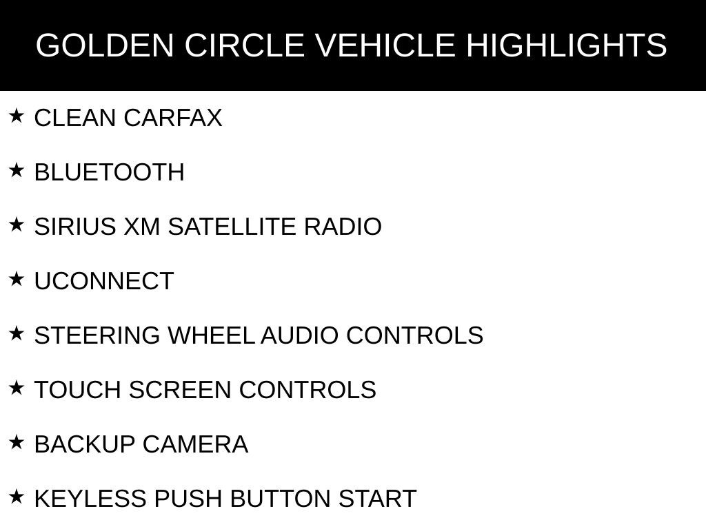 CLEAN CARFAX, BLUETOOTH, SIRIUS XM SATELLITE RADIO, UCONNECT, STEERING WHEEL AUDIO CONTROLS, TOUCH SCREEN CONTROLS, BACKUP CAMERA, KEYLESS PUSH BUTTON START, POWER DRIVER SEAT, SUNROOF/MOONROOF, ALL WEATHER FLOOR MATS, CROSSROAD SERIES, QUICK ORDER PACKAGE 22S, 19" BLACK NOISE ALUMINUM WHEELS, 6 SPEAKERS, AIR CONDITIONING, ANTI-WHIPLASH FRONT HEAD RESTRAINTS, AUTO-DIMMING REAR-VIEW MIRROR, AUTOMATIC TEMPERATURE CONTROL, BRAKE ASSIST, CD PLAYER, COMPASS, DELAY-OFF HEADLIGHTS, DRIVER VANITY MIRROR, FOUR WHEEL INDEPENDENT SUSPENSION, FRONT DUAL ZONE A/C, FRONT FOG LIGHTS, HEATED DOOR MIRRORS, LOW TIRE PRESSURE WARNING, OCCUPANT SENSING AIRBAG, OUTSIDE TEMPERATURE DISPLAY, OVERHEAD CONSOLE, PANIC ALARM, PASSENGER VANITY MIRROR, POWER DOOR MIRRORS, POWER WINDOWS, REAR AIR CONDITIONING, REAR WINDOW DEFROSTER, REAR WINDOW WIPER, RECLINING 3RD ROW SEAT, REMOTE KEYLESS ENTRY, SPEED CONTROL, SPEED-SENSING STEERING, SPEED-SENSITIVE WIPERS, TELESCOPING STEERING WHEEL, TILT STEERING WHEEL, TOURING SUSPENSION, TRACTION CONTROL, VARIABLY INTERMITTENT WIPERS.