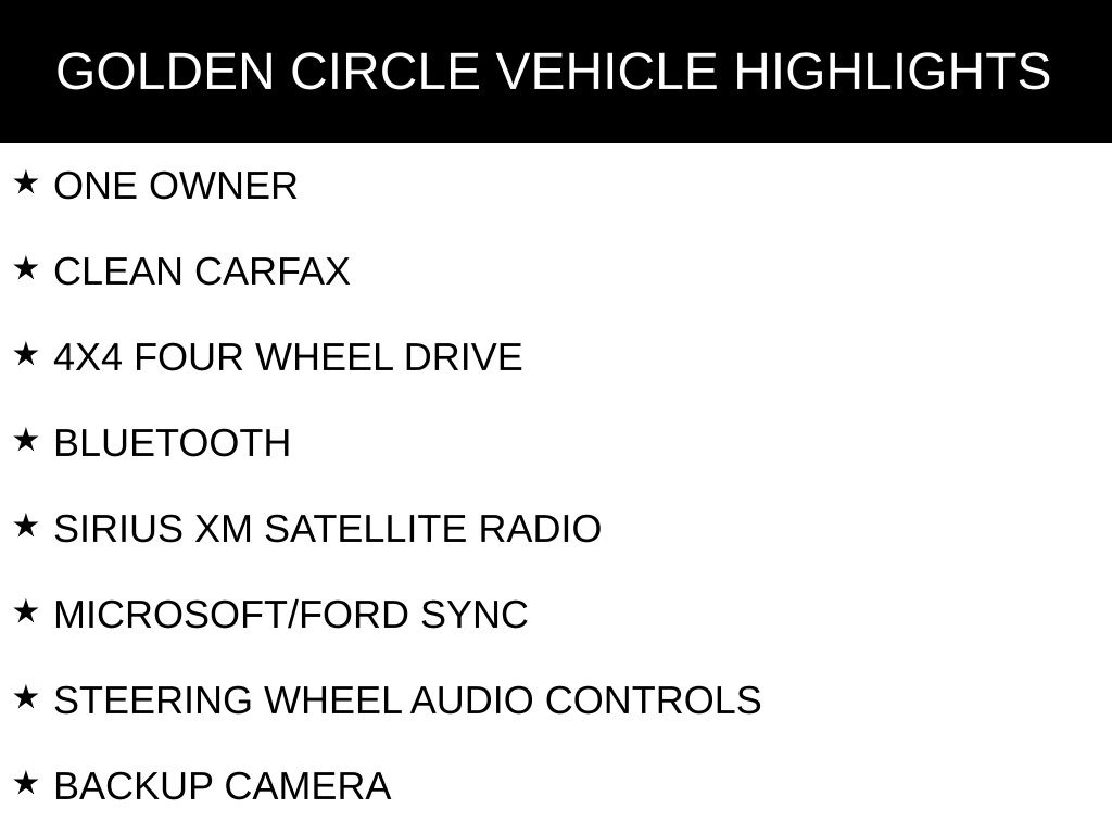 ONE OWNER, CLEAN CARFAX, 4X4 FOUR WHEEL DRIVE, CUSTOM BED COVER, BLUETOOTH, SIRIUS XM SATELLITE RADIO, MICROSOFT/FORD SYNC, STEERING WHEEL AUDIO CONTROLS, BACKUP CAMERA, POWER DRIVER SEAT, POWER PASSENGER SEAT, HEATED FRONT CLOTH SEATS, REMOTE START, SPRAY-IN BEDLINER, TOW PACKAGE / TRAILER PACKAGE, INTEGRATED TRAILER BRAKE CONTROLLER, RUNNING BOARDS, XLT SERIES, EQUIPMENT PACKAGE 302A LUXURY, TRAILER TOW PACKAGE, XLT CHROME APPEARACE PACKAGE, 20" CHROME LIKE PVD WHEELS, 6 SPEAKERS, AIR CONDITIONING, AUTO-DIMMING REAR-VIEW MIRROR, AUXILIARY TRANSMISSION OIL COOLER, BRAKE ASSIST, CLASS IV TRAILER HITCH RECEIVER, COMPASS, DELAY-OFF HEADLIGHTS, DRIVER VANITY MIRROR, DUAL FRONT IMPACT AIRBAGS, DUAL FRONT SIDE IMPACT AIRBAGS, ELECTRONIC LOCKING W/3.55 AXLE RATIO, FRONT CENTER ARMREST W/STORAGE, FRONT FOG LIGHTS, INTEGRATED TRAILER BRAKE CONTROLLER, LOW TIRE PRESSURE WARNING, OCCUPANT SENSING AIRBAG, OUTSIDE TEMPERATURE DISPLAY, PASSENGER VANITY MIRROR, POWER GLASS HEATED SIDEVIEW MIRRORS, POWER WINDOWS, POWER-ADJUSTABLE PEDALS, POWER-SLIDING REAR WINDOW, REAR STEP BUMPER, REAR UNDER-SEAT STORAGE, REAR WINDOW DEFROSTER, REMOTE KEYLESS ENTRY, SECURITY SYSTEM, SINGLE-TIP CHROME EXHAUST, SPEED-SENSING STEERING, SPLIT FOLDING REAR SEAT, TACHOMETER, TELESCOPING STEERING WHEEL, TRACTION CONTROL, VARIABLY INTERMITTENT WIPERS.