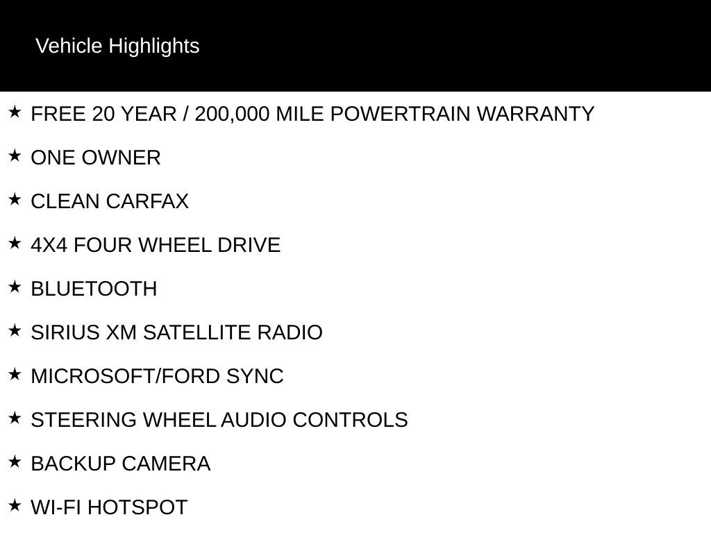 FREE 20 YEAR / 200,000 MILE POWERTRAIN WARRANTY, ONE OWNER, CLEAN CARFAX, 4X4 FOUR WHEEL DRIVE, BLUETOOTH, SIRIUS XM SATELLITE RADIO, MICROSOFT/FORD SYNC, STEERING WHEEL AUDIO CONTROLS, BACKUP CAMERA, WI-FI HOTSPOT, KEYLESS PUSH BUTTON START, EQUIPMENT PACKAGE 101A, 7 SPEAKERS, AIR CONDITIONING, BRAKE ASSIST, COMPASS, DELAY-OFF HEADLIGHTS, DRIVER VANITY MIRROR, ELECTRONIC STABILITY CONTROL, EMERGENCY COMMUNICATION SYSTEM: 911 ASSIST, EXTERIOR PARKING CAMERA REAR, HEATED DOOR MIRRORS, ILLUMINATED ENTRY, INTEGRATED ROLL-OVER PROTECTION, LOW TIRE PRESSURE WARNING, OCCUPANT SENSING AIRBAG, OUTSIDE TEMPERATURE DISPLAY, OVERHEAD CONSOLE, PANIC ALARM, PASSENGER VANITY MIRROR, POWER DOOR MIRRORS, POWER WINDOWS, REMOTE KEYLESS ENTRY, SPEED CONTROL, TELESCOPING STEERING WHEEL, TILT STEERING WHEEL, VARIABLY INTERMITTENT WIPERS, WHEELS: 16" BRIGHT POLISHED SILVER-PAINTED STEEL.