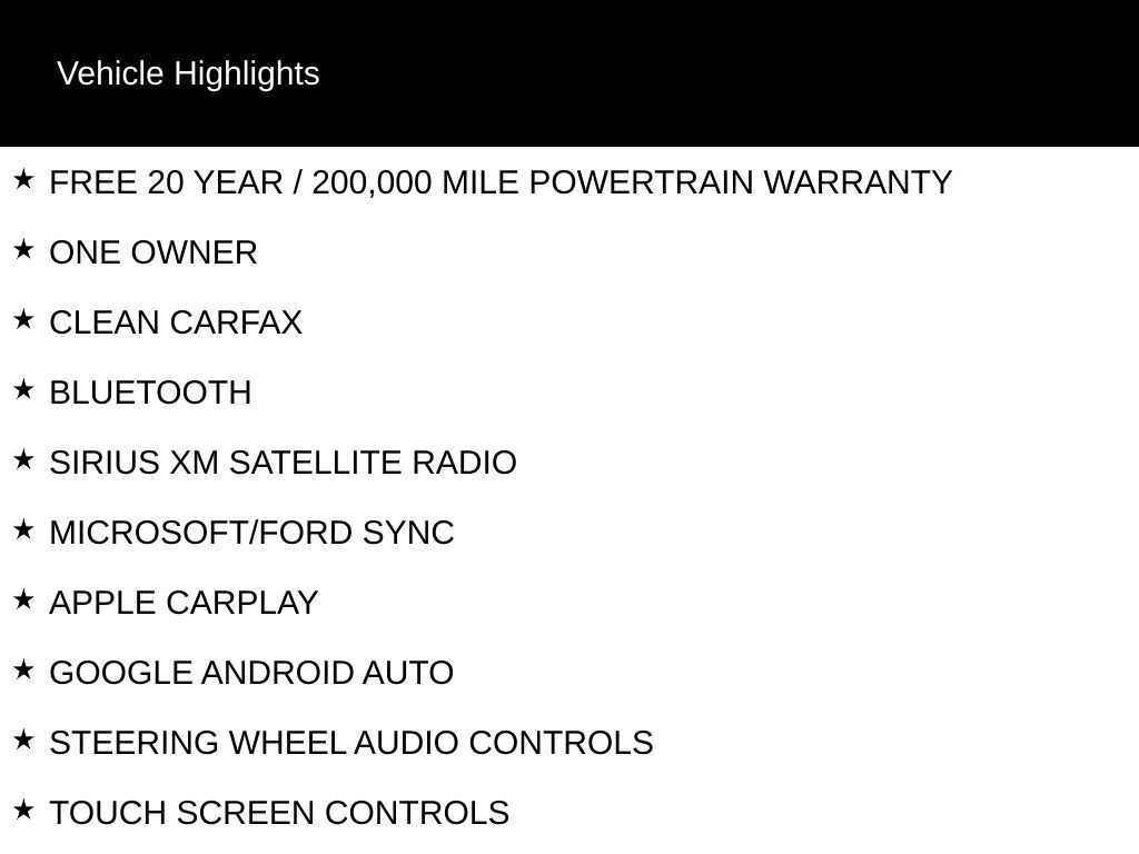 FREE 20 YEAR / 200,000 MILE POWERTRAIN WARRANTY, ONE OWNER, CLEAN CARFAX, BLUETOOTH, SIRIUS XM SATELLITE RADIO, MICROSOFT/FORD SYNC, APPLE CARPLAY, GOOGLE ANDROID AUTO, STEERING WHEEL AUDIO CONTROLS, TOUCH SCREEN CONTROLS, BACKUP CAMERA, KEYLESS PUSH BUTTON START, AUTOMATIC HEADLIGHTS, POWER DRIVER SEAT, REMOTE START, POWER LIFTGATE, HEATED STEERING WHEEL, HEATED FRONT LEATHERETTE SEATS, XLT SERIES, EQUIPMENT PACKAGE 202A, 18" 5-SPOKE SILVER PAINTED ALUMINUM WHEELS, 6 SPEAKERS, AIR CONDITIONING, AUTOMATIC TEMPERATURE CONTROL, BRAKE ASSIST, COMPASS, DELAY-OFF HEADLIGHTS, DRIVER VANITY MIRROR, ELECTRONIC STABILITY CONTROL, EMERGENCY COMMUNICATION SYSTEM: SYNC 3 911 ASSIST, FOUR WHEEL INDEPENDENT SUSPENSION, FRONT DUAL ZONE A/C, HEATED DOOR MIRRORS, LOW TIRE PRESSURE WARNING, OCCUPANT SENSING AIRBAG, OUTSIDE TEMPERATURE DISPLAY, OVERHEAD CONSOLE, PANIC ALARM, PASSENGER VANITY MIRROR, POWER DOOR MIRRORS, POWER STEERING, POWER WINDOWS, REAR AIR CONDITIONING, REAR AUXILIARY CONTROLS CREDIT, REAR WINDOW DEFROSTER, REAR WINDOW WIPER, REMOTE KEYLESS ENTRY, SECURICODE KEYLESS ENTRY KEYPAD, SPEED CONTROL, SPEED-SENSING STEERING, SPEED-SENSITIVE WIPERS, SPLIT FOLDING REAR SEAT, TELESCOPING STEERING WHEEL, TILT STEERING WHEEL, VARIABLY INTERMITTENT WIPERS.