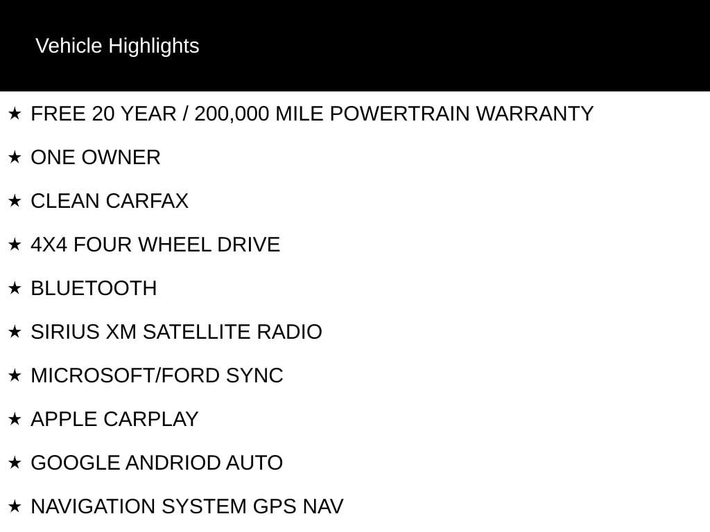 FREE 20 YEAR / 200,000 MILE POWERTRAIN WARRANTY, ONE OWNER, CLEAN CARFAX, 4X4 FOUR WHEEL DRIVE, BLUETOOTH, SIRIUS XM SATELLITE RADIO, MICROSOFT/FORD SYNC, APPLE CARPLAY, GOOGLE ANDRIOD AUTO, NAVIGATION SYSTEM GPS NAV, STEERING WHEEL AUDIO CONTROLS, BACKUP CAMERA, WI-FI HOTSPOT, KEYLESS PUSH BUTTON START, AUTOMATIC HEADLIGHTS, COLLISION AVOIDANCE SYSTEM, COLLISION WARNING ALERT SYSTEM, POWER DRIVER SEAT, POWER PASSENGER SEAT, HEATED FRONT LEATHER SEATS, REMOTE START, SPRAY-IN BEDLINER, TOW PACKAGE / TRAILER PACKAGE, INTEGRATED TRAILER BRAKE CONTROLLER, RUNNING BOARDS, BANG & OLUFSEN HIGH END SOUND PACKAGE, TREMOR SERIES, BED UTILITY PACKAGE, EQUIPMENT PACKAGE 401A STANDARD, TRAILER TOW PACKAGE, 18" ALLOY W/ DARK MATTE FINISH WHEELS, 6 SPEAKERS, AIR CONDITIONING, AUTO-DIMMING DOOR MIRRORS, AUTOMATIC TEMPERATURE CONTROL, BOXLINK, BRAKE ASSIST, CLASS IV TRAILER HITCH RECEIVER, COMPASS, DELAY-OFF HEADLIGHTS, ELECTRONIC LOCKING W/3.73 AXLE RATIO, ELECTRONIC STABILITY CONTROL, EMERGENCY COMMUNICATION SYSTEM: SYNC 4 911 ASSIST, FRONT CENTER ARMREST, FRONT DUAL ZONE A/C, FRONT FOG LIGHTS, HEATED DOOR MIRRORS, ILLUMINATED ENTRY, LOW TIRE PRESSURE WARNING, OCCUPANT SENSING AIRBAG, OUTSIDE TEMPERATURE DISPLAY, OVERHEAD CONSOLE, PANIC ALARM, PASSENGER VANITY MIRROR, POWER DOOR MIRRORS, POWER TAILGATE, POWER WINDOWS, REAR STEP BUMPER, REAR WINDOW DEFROSTER, REMOTE KEYLESS ENTRY, SPEED CONTROL, SPEED-SENSING STEERING, SPLIT FOLDING REAR SEAT, SYNC 4 W/ENHANCED VOICE RECOGNITION, TAILGATE STEP W/TAILGATE WORK SURFACE, TELESCOPING STEERING WHEEL, TILT STEERING WHEEL, TRACTION CONTROL, TURN SIGNAL INDICATOR MIRRORS, VARIABLY INTERMITTENT WIPERS, ZONE LIGHTING.
