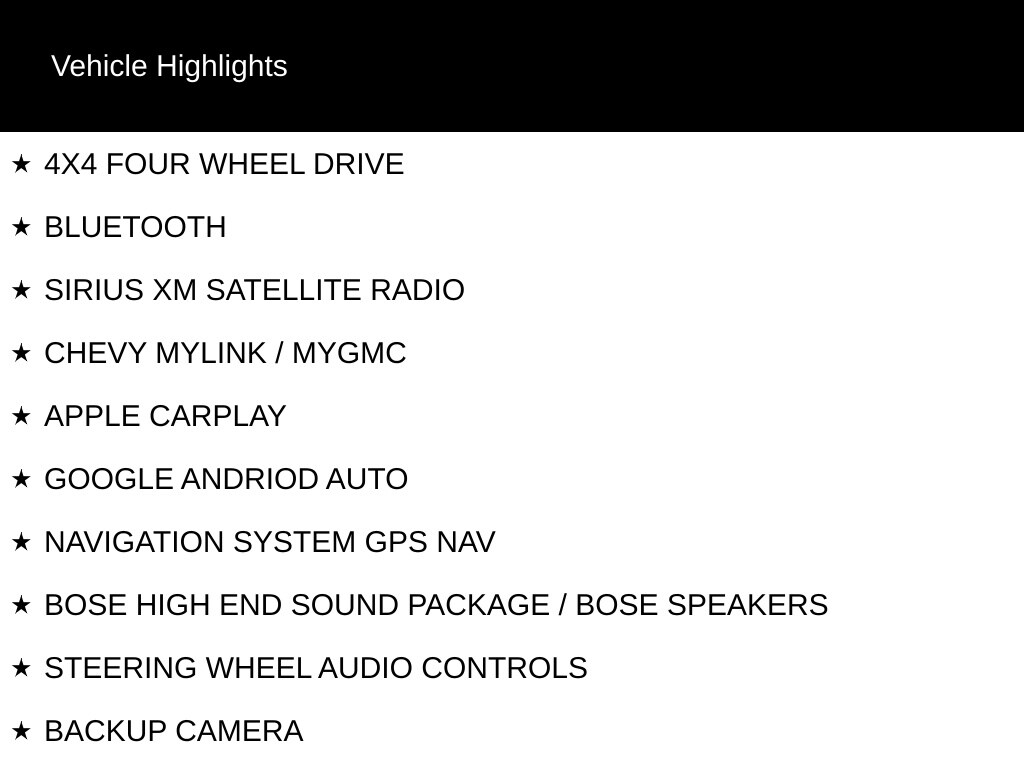 4X4 FOUR WHEEL DRIVE, DURAMAX 6..6L TURBO-DIESEL ENGINE, BLUETOOTH, SIRIUS XM SATELLITE RADIO, CHEVY MYLINK / MYGMC, APPLE CARPLAY, GOOGLE ANDRIOD AUTO, NAVIGATION SYSTEM GPS NAV, BOSE HIGH END SOUND PACKAGE / BOSE SPEAKERS, STEERING WHEEL AUDIO CONTROLS, BACKUP CAMERA, WIRELESS CHARGING, AUTOMATIC HEADLIGHTS, COLLISION AVOIDANCE SYSTEM, COLLISION WARNING ALERT SYSTEM, POWER DRIVER SEAT, POWER PASSENGER SEAT, HEATED/COOLED LEATHER SEATS, SUNROOF/MOONROOF, HEATED STEERING WHEEL, SPRAY-IN BEDLINER, DENALI SERIES, DRIVER ALERT PACKAGE, DURAMAX PLUS PACKAGE, TRAILERING EQUIPMENT, PREFERRED EQUIPMENT PACKAGE 5SA, 20" CHROME CAST ALUMINUM WHEELS , 110-VOLT AC POWER OUTLET, 4.10 REAR AXLE RATIO, ADJUSTABLE PEDALS, AIR CONDITIONING, AUTO-DIMMING DOOR MIRRORS, AUTO-DIMMING REAR-VIEW MIRROR, AUTOMATIC TEMPERATURE CONTROL, BLACK FRAME-MOUNTED FRONT RECOVERY HOOKS, BOSE 7 SPEAKER SOUND SYSTEM, BRAKE ASSIST, CHROME POWER-ADJUSTABLE HEATED OUTSIDE MIRRORS, CHROME RECOVERY HOOKS, COMPASS, DEEP-TINTED GLASS, DRIVER VANITY MIRROR, DUAL-ZONE AUTOMATIC CLIMATE CONTROL, ELECTRIC REAR-WINDOW DEFOGGER, EXHAUST BRAKE, EZ-LIFT & LOWER TAILGATE, FRONT DUAL ZONE A/C, FRONT FOG LIGHTS, FRONT HALOGEN FOG LAMPS, FRONT LICENSE PLATE KIT, GMC 4G LTE, GMC CONNECTED ACCESS, HILL DESCENT CONTROL, LANE DEPARTURE WARNING SYSTEM, LOW TIRE PRESSURE WARNING, OCCUPANT SENSING AIRBAG, OUTSIDE TEMPERATURE DISPLAY, PASSENGER VANITY MIRROR, POWER SLIDING REAR WINDOW W/DEFOGGER, POWER WINDOWS, REAR 60/40 FOLDING BENCH SEAT (FOLDS UP), REAR WINDOW DEFROSTER, REMOTE KEYLESS ENTRY, REMOTE LOCKING TAILGATE, SPEED CONTROL, SPEED-SENSING STEERING, TELESCOPING STEERING WHEEL, THEFT DETERRENT SYSTEM (UNAUTHORIZED ENTRY), TILT STEERING WHEEL, TURN SIGNAL INDICATOR MIRRORS.