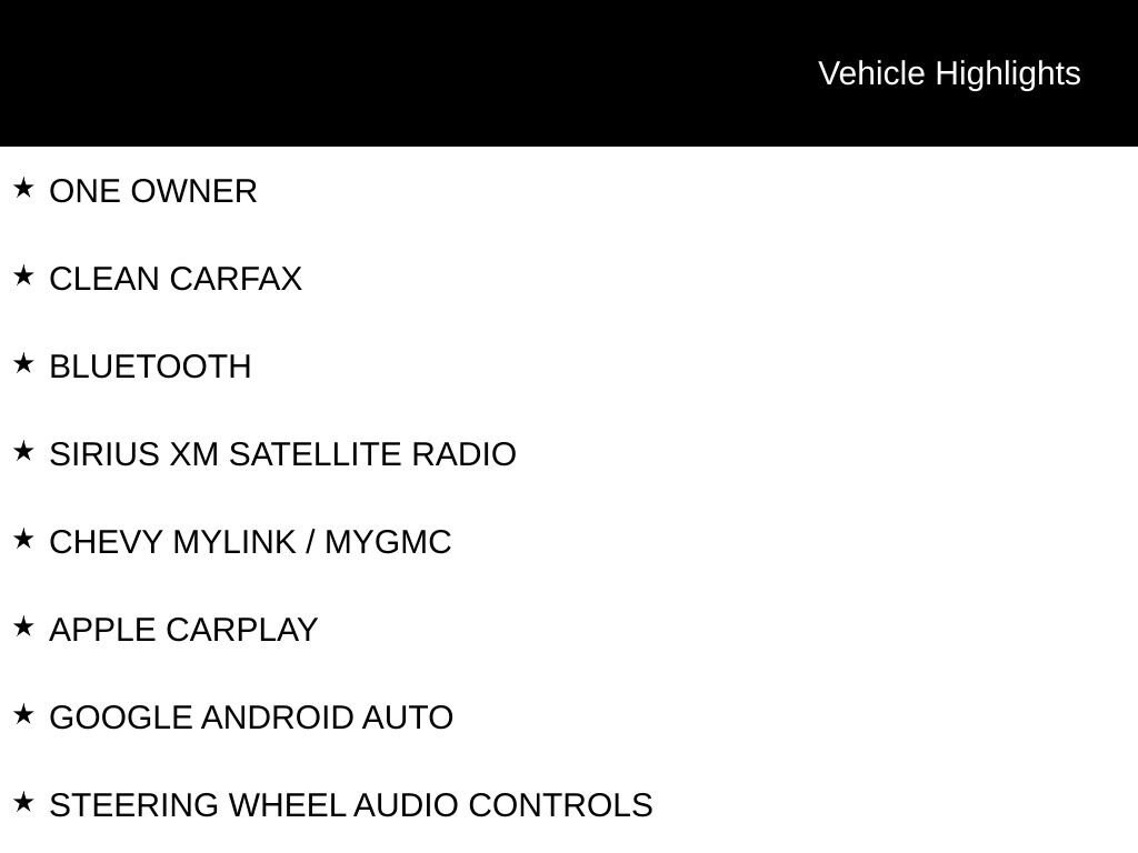 ONE OWNER, CLEAN CARFAX, BLUETOOTH, SIRIUS XM SATELLITE RADIO, CHEVY MYLINK / MYGMC, APPLE CARPLAY, GOOGLE ANDROID AUTO, STEERING WHEEL AUDIO CONTROLS, TOUCH SCREEN CONTROLS, BACKUP CAMERA, SPRAY-IN BEDLINER, TOW PACKAGE / TRAILER PACKAGE, ALL WEATHER FLOOR MATS, SLE1 SERIES, ELEVATION EDITION, PREFERRED EQUIPMENT PACKAGE 2LE, SLE CONVENIENCE PACKAGE, TRAILERING PACKAGE, 18 MULTI SPOKE SATIN GRAPHITE WHEELS, 4.10 REAR AXLE RATIO, 6-SPEAKER AUDIO SYSTEM FEATURE, AIR CONDITIONING, AUTOMATIC LOCKING REAR DIFFERENTIAL, COMPASS, DELAY-OFF HEADLIGHTS, DRIVER VANITY MIRROR, DUAL FRONT IMPACT AIRBAGS, DUAL FRONT SIDE IMPACT AIRBAGS, ELECTRONIC STABILITY CONTROL, FRONT FOG LIGHTS, FRONT LICENSE PLATE KIT, HEATED DOOR MIRRORS, LOW TIRE PRESSURE WARNING, OCCUPANT SENSING AIRBAG, OUTSIDE TEMPERATURE DISPLAY, OVERHEAD CONSOLE, PANIC ALARM, PASSENGER VANITY MIRROR, POWER DOOR MIRRORS, POWER WINDOWS, PREMIUM AUDIO SYSTEM: GMC INFOTAINMENT SYSTEM, REAR WINDOW DEFROSTER, REMOTE KEYLESS ENTRY, SECURITY SYSTEM, SINGLE-ZONE AUTO CLIMATE CONTROL AIR CONDITIONING, SPEED CONTROL, SPEED-SENSING STEERING, TELESCOPING STEERING WHEEL, TILT STEERING WHEEL, TOW/HAUL MODE, TRAILERING ASSIST GUIDELINE HITCH GUIDANCE, VARIABLY INTERMITTENT WIPERS.