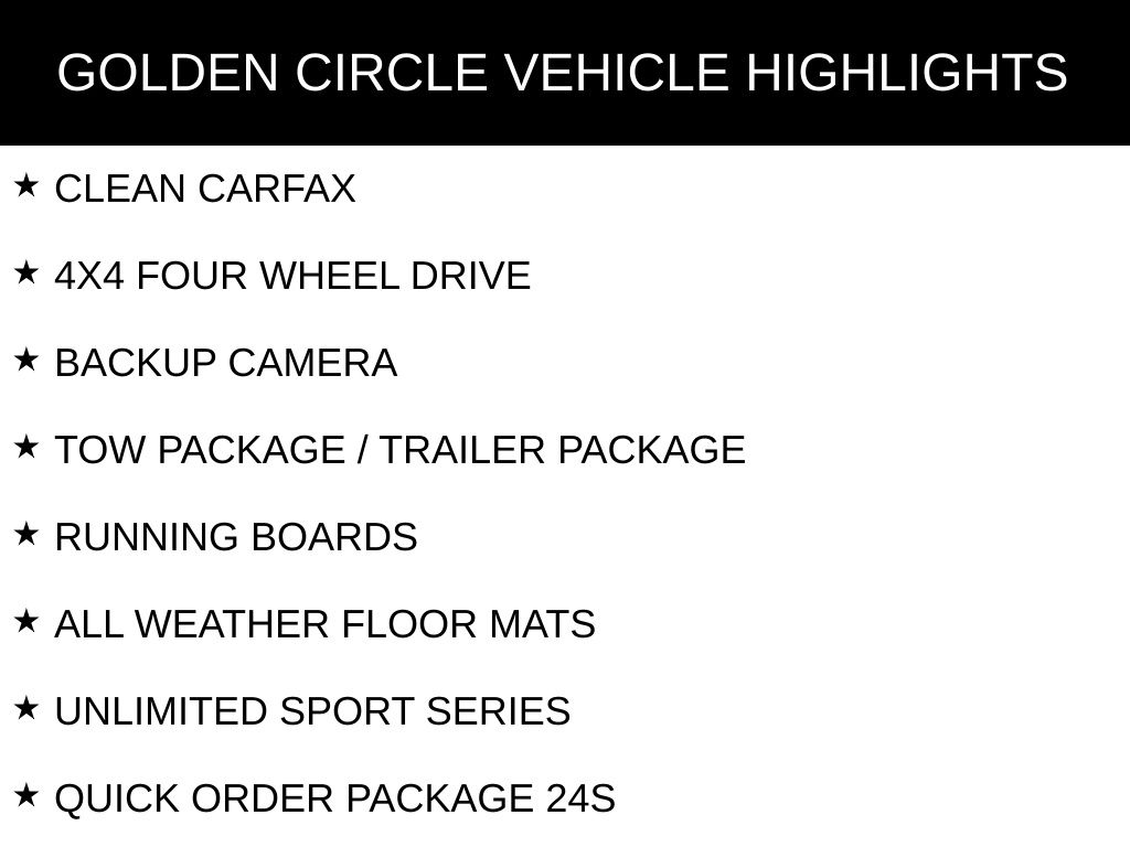 CLEAN CARFAX, 4X4 FOUR WHEEL DRIVE, CUSTOM WHEELS AND TIRES, CUSTOM FRONT BUMPER, BACKUP CAMERA, TOW PACKAGE / TRAILER PACKAGE, RUNNING BOARDS, ALL WEATHER FLOOR MATS, UNLIMITED SPORT SERIES, QUICK ORDER PACKAGE 24S, 8 SPEAKERS, AIR CONDITIONING, BRAKE ASSIST, COLOR MATCHING 3-PIECE HARD TOP, COMPASS, DEEP TINT SUNSCREEN WINDOWS, DELETE SUNRIDER SOFT TOP, DRIVER VANITY MIRROR, DUAL FRONT IMPACT AIRBAGS, FREEDOM PANEL STORAGE BAG, FRONT FOG LIGHTS, LOW TIRE PRESSURE WARNING, NORMAL DUTY SUSPENSION, OCCUPANT SENSING AIRBAG, OUTSIDE TEMPERATURE DISPLAY, PASSENGER VANITY MIRROR, POWER CONVENIENCE GROUP, POWER HEATED MIRRORS, REAR WINDOW DEFROSTER, REAR WINDOW WIPER/WASHER, REMOTE KEYLESS ENTRY, SECURITY ALARM, SPEED CONTROL, TILT STEERING WHEEL, TINTED REAR QUARTER & LIFTGATE WINDOWS, VARIABLY INTERMITTENT WIPERS.
