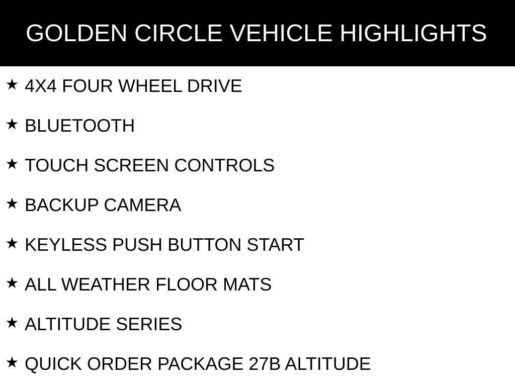 4X4 FOUR WHEEL DRIVE, BLUETOOTH, TOUCH SCREEN CONTROLS, BACKUP CAMERA, KEYLESS PUSH BUTTON START, ALL WEATHER FLOOR MATS, ALTITUDE SERIES, QUICK ORDER PACKAGE 27B ALTITUDE, 18" BLACK ALUMINUM WHEELS, 6 SPEAKERS, AIR CONDITIONING, ALTITUDE SPECIAL EDITION, ANTI-WHIPLASH FRONT HEAD RESTRAINTS, BLACK ROOF, BRAKE ASSIST, COMPASS, DELAY-OFF HEADLIGHTS, DRIVER VANITY MIRROR, DUAL FRONT IMPACT AIRBAGS, DUAL FRONT SIDE IMPACT AIRBAGS, ELECTRONIC STABILITY CONTROL, FOUR WHEEL INDEPENDENT SUSPENSION, FRONT FOG LIGHTS, HEATED DOOR MIRRORS, LOW TIRE PRESSURE WARNING, OCCUPANT SENSING AIRBAG, OUTSIDE TEMPERATURE DISPLAY, OVERHEAD CONSOLE, PANIC ALARM, PARKVIEW REAR BACK-UP CAMERA, PASSENGER VANITY MIRROR, PIANO BLACK INTERIOR ACCENTS, POWER DOOR MIRRORS, POWER WINDOWS, REAR WINDOW DEFROSTER, REAR WINDOW WIPER, REMOTE KEYLESS ENTRY, SPEED CONTROL, TELESCOPING STEERING WHEEL, TILT STEERING WHEEL, TRACTION CONTROL, VARIABLY INTERMITTENT WIPERS.
