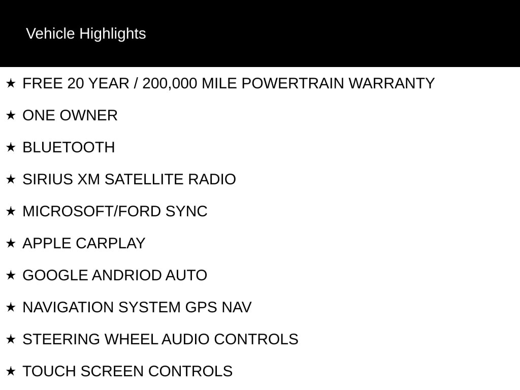 FREE 20 YEAR / 200,000 MILE POWERTRAIN WARRANTY, ONE OWNER, BLUETOOTH, SIRIUS XM SATELLITE RADIO, MICROSOFT/FORD SYNC, APPLE CARPLAY, GOOGLE ANDRIOD AUTO, NAVIGATION SYSTEM GPS NAV, STEERING WHEEL AUDIO CONTROLS, TOUCH SCREEN CONTROLS, BACKUP CAMERA, HOMELINK UNIVERSAL GARAGE DOOR OPENER, WI-FI HOTSPOT, KEYLESS PUSH BUTTON START, POWER DRIVER SEAT, POWER PASSENGER SEAT, HEATED FRONT LEATHER SEATS, REMOTE START, STANDARD SERIES, CONVENIENCE PACKAGE, EQUIPMENT PACKAGE 100A, 18" PREMIUM PAINTED MACHINED HIGH-GLOSS WHEELS, 11 SPEAKERS, 110V/150W AC POWER OUTLET, ADAPTIVE SUSPENSION, AIR CONDITIONING, AUTO-DIMMING DOOR MIRRORS, AUTOMATIC TEMPERATURE CONTROL, BRAKE ASSIST, COMPASS, DELAY-OFF HEADLIGHTS, DRIVER VANITY MIRROR, DYNAMIC SIGNATURE LIGHTING, EMERGENCY COMMUNICATION SYSTEM: SYNC 3 911 ASSIST, FRONT DUAL ZONE A/C, FULLY AUTOMATIC HEADLIGHTS, HEATED DOOR MIRRORS, LOW TIRE PRESSURE WARNING, OCCUPANT SENSING AIRBAG, OUTSIDE TEMPERATURE DISPLAY, OVERHEAD CONSOLE, PANIC ALARM, PASSENGER VANITY MIRROR, POWER DOOR MIRRORS, POWER TILT/TELESCOPING STEERING WHEEL W/MEMORY, POWER WINDOWS, RAIN SENSING WIPERS, REAR PARKING SENSORS, REAR WINDOW DEFROSTER, REMOTE KEYLESS ENTRY, SMART POWER MIRRORS, SPEED CONTROL, SPEED-SENSING STEERING, SPEED-SENSITIVE WIPERS, SPLIT FOLDING REAR SEAT, TURN SIGNAL INDICATOR MIRRORS, VARIABLY INTERMITTENT WIPERS.