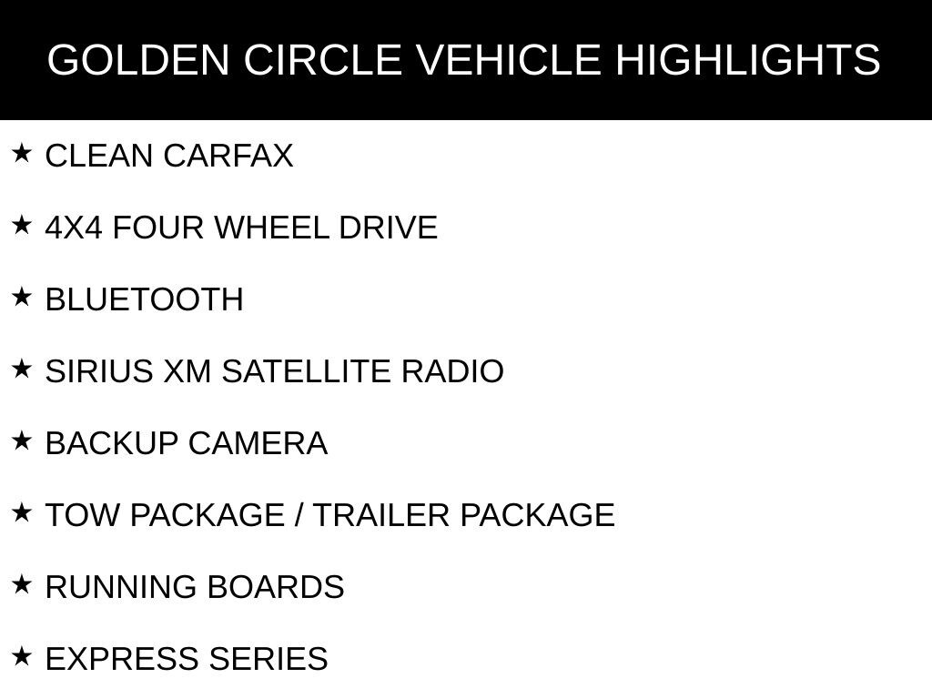 CLEAN CARFAX, 4X4 FOUR WHEEL DRIVE, BLUETOOTH, SIRIUS XM SATELLITE RADIO, BACKUP CAMERA, TOW PACKAGE / TRAILER PACKAGE, RUNNING BOARDS, EXPRESS SERIES, POPULAR EQUIPMENT GROUP, POWER & REMOTE ENTRY GROUP, QUICK ORDER PACKAGE 26C EXPRESS, 20" ALUMINUM WHEELS, 3.21 REAR AXLE RATIO, 6 SPEAKERS, ADD CLASS IV RECEIVER HITCH, AIR CONDITIONING, BODY COLOR FRONT FASCIA, BRAKE ASSIST, DELAY-OFF HEADLIGHTS, DUAL FRONT IMPACT AIRBAGS, DUAL FRONT SIDE IMPACT AIRBAGS, DUAL REAR EXHAUST W/BRIGHT TIPS, ELECTRONIC STABILITY CONTROL, FOG LAMPS, FRONT ARMREST W/THREE CUPHOLDERS, FRONT WHEEL INDEPENDENT SUSPENSION, FULLY AUTOMATIC HEADLIGHTS, LOW TIRE PRESSURE WARNING, OCCUPANT SENSING AIRBAG, POWER HEATED FOLD-AWAY MIRRORS, POWER STEERING, POWER WINDOWS W/FRONT ONE-TOUCH DOWN, RADIO DATA SYSTEM, RADIO: UCONNECT 3.0 AM/FM, SPEED CONTROL, TILT STEERING WHEEL, TRACTION CONTROL, VARIABLY INTERMITTENT WIPERS.