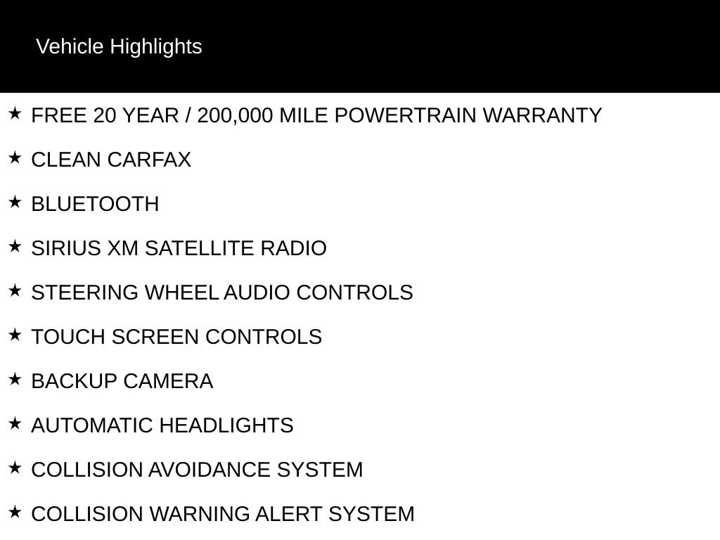 FREE 20 YEAR / 200,000 MILE POWERTRAIN WARRANTY, CLEAN CARFAX, BLUETOOTH, SIRIUS XM SATELLITE RADIO, STEERING WHEEL AUDIO CONTROLS, TOUCH SCREEN CONTROLS, BACKUP CAMERA, AUTOMATIC HEADLIGHTS, COLLISION AVOIDANCE SYSTEM, COLLISION WARNING ALERT SYSTEM, TOW PACKAGE / TRAILER PACKAGE, LE SERIES, ALL WEATHER LINER PACKAGE, 17" WHEELS, 6 SPEAKERS, AIR CONDITIONING, BRAKE ASSIST, CARGO LINER, DRIVER VANITY MIRROR, DUAL FRONT SIDE IMPACT AIRBAGS, ELECTRONIC STABILITY CONTROL, FRONT BUCKET SEATS, FRONT CENTER ARMREST, LOW TIRE PRESSURE WARNING, OCCUPANT SENSING AIRBAG, OUTSIDE TEMPERATURE DISPLAY, OVERHEAD CONSOLE, PANIC ALARM, PASSENGER VANITY MIRROR, POWER DOOR MIRRORS, POWER WINDOWS, RADIO: ENTUNE 3.0 AUDIO, REAR WINDOW DEFROSTER, REAR WINDOW WIPER, REMOTE KEYLESS ENTRY, SPEED CONTROL, SPEED-SENSING STEERING, TELESCOPING STEERING WHEEL, TILT STEERING WHEEL.